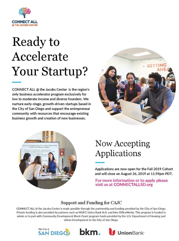 SAN DIEGO – CONNECT ALL @ the Jacobs Center (CAJC), the region’s first low-to-moderate income- and diversity-focused business accelerator program, has announced applications for the fall 2019 cohort of local entrepreneurs. Applications will be accepted through August 26.